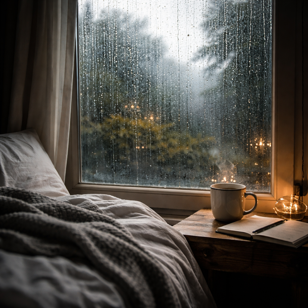 | Watching rain through a window from inside | Emotional distance, reflection, feeling protected but separate |